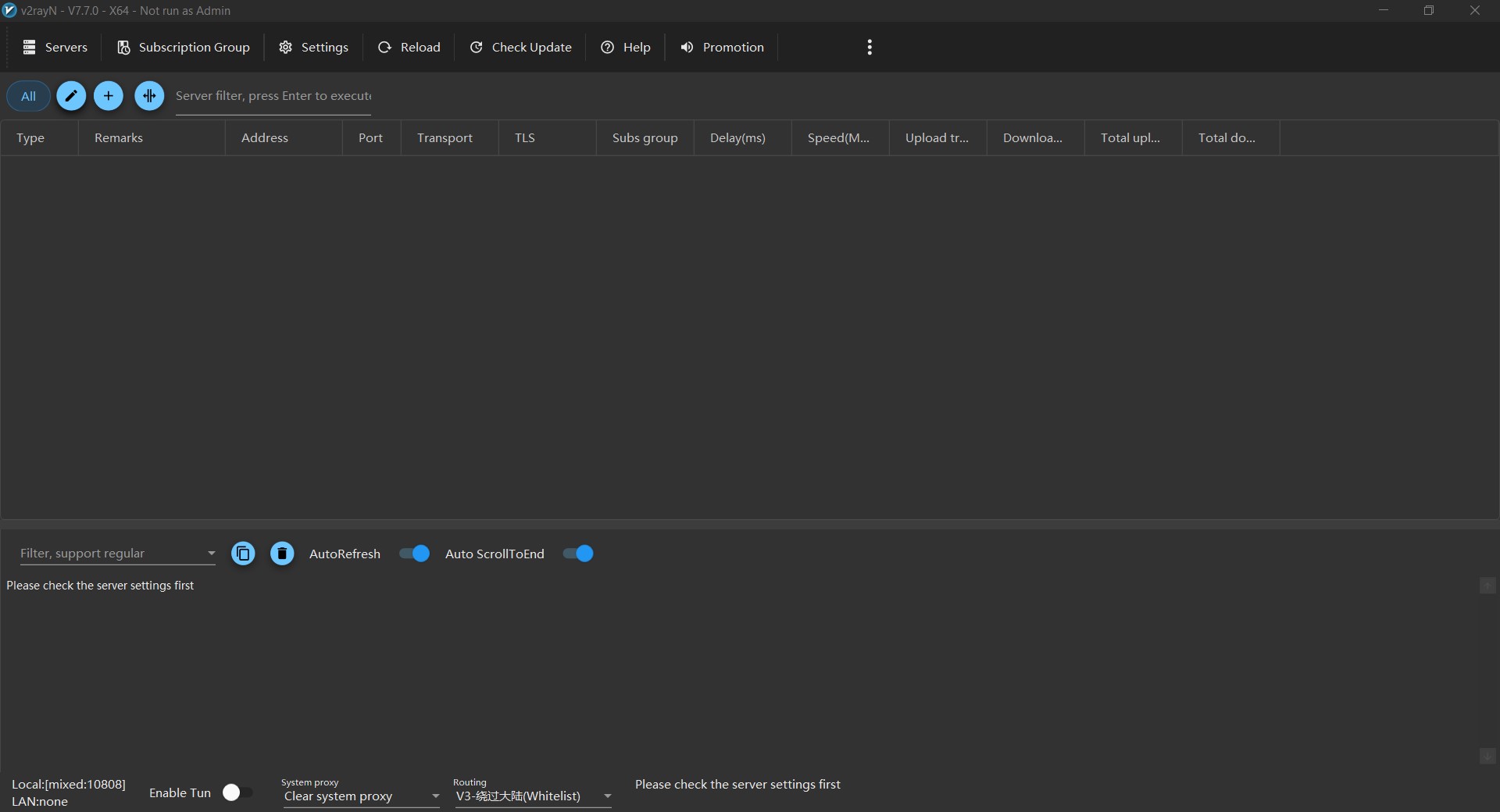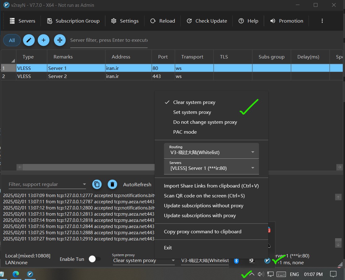 پس از چند ثانیه، برنامه V2RayN باز شده و آیکون آن در نوار وظیفه و سیستم تری ویندوز ظاهر میشود
