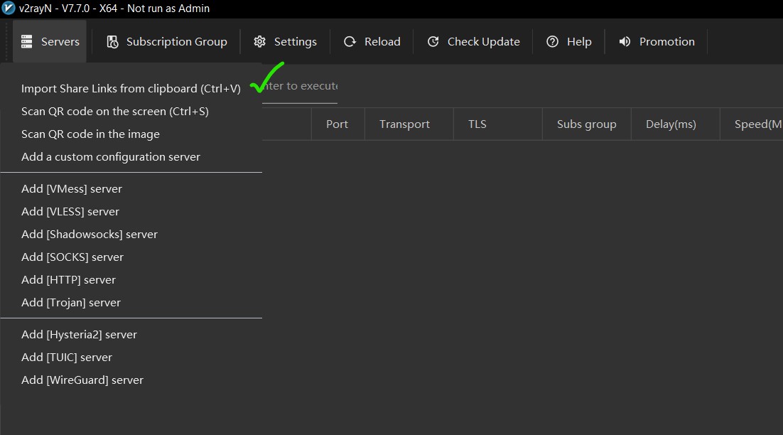 در برنامه V2RayN، از منوی Server، گزینه Import bulk URL form clipboard را انتخاب کنید